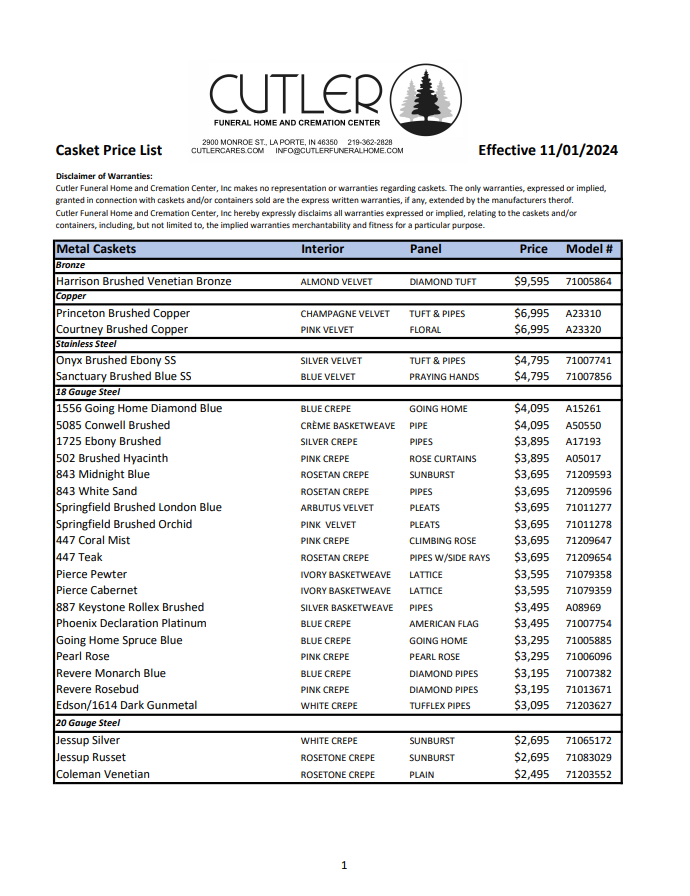Cutler Funeral Home and Cremation Center, Inc makes no representation or warranties regarding caskets. The only warranties, expressed or implied, granted in connection with caskets and/or containers sold are the express written warranties, if any, extended by the manufacturers thereof.